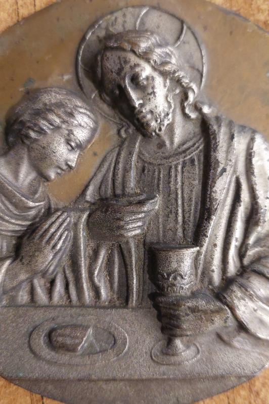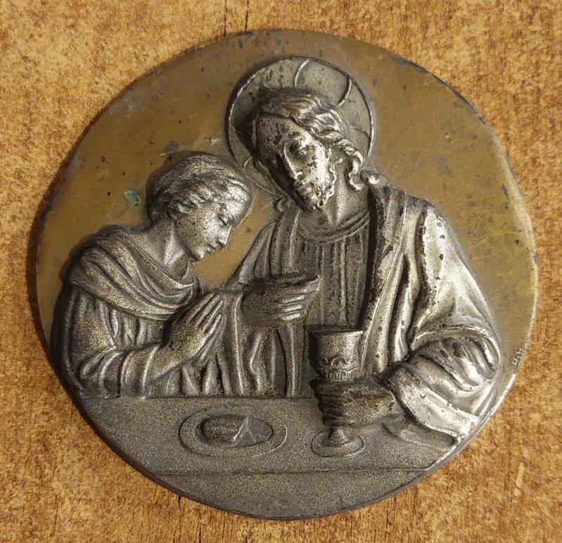 Avrupa (Almanya/Fransa), Hz. İsa ve Kadın Havarilerinden Magdalalı Meryem Temalı Büyük Boy Kabartmalı Madalyon Tarzda Dini Plaket-Levha. (Kalp Gözü) Çok Eski Mükemmel Detaylı Orijinal Bir Parça. 1900'ler. Kabartma Rölyef/Prinç-Kalay, Gümüş Kaplama. Patinalı. (10 cm) Nadir.