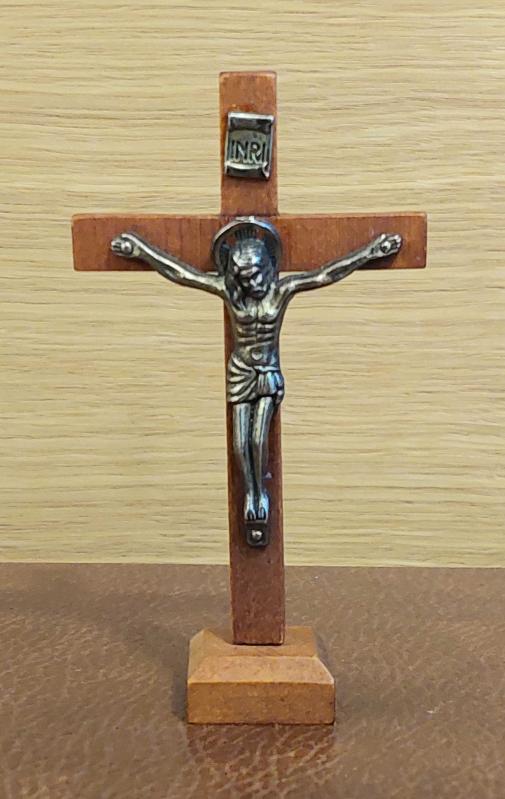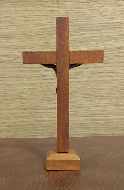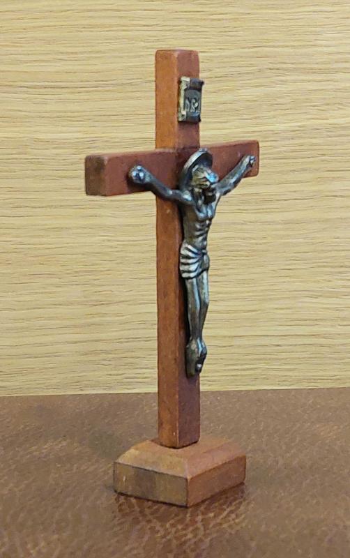 Avrupa, İsa Figürlü (Çarmıh) Minyatür Kaideli Haç. Açık Renk Ahşap ve Pirinç Metal Döküm Figür. 2000'ler. (22x57x106 mm)