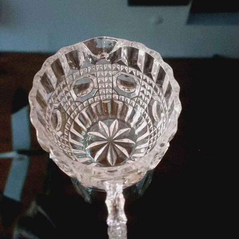 Kristal cam sütlük ve şekerlik takimi. Sütluķ asimetrik formda gagali ve kulplu. Harika kondisyonda. Avrupa menşeili(Muhtemel Çek ) Sütlük 7 x 7 cm (kulp haric) Şekerlik 8 x 5 cm