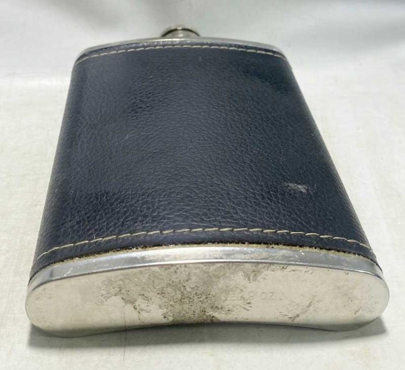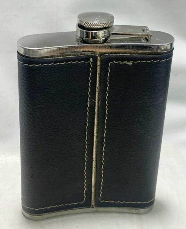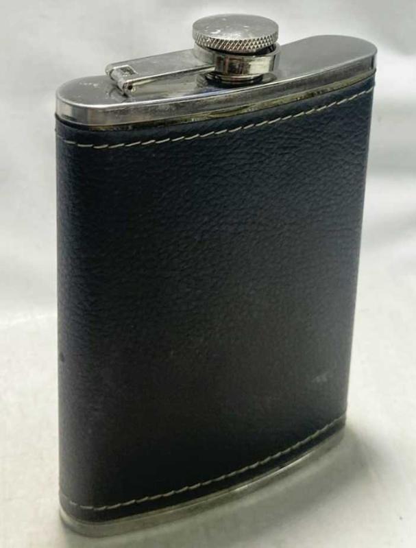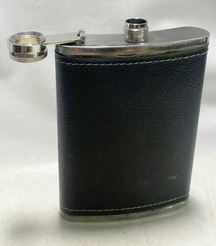 Avrupa Tasarımı Cep Matarası/9 oz. Paslamaz Çelik, Üzeri (Siyah) Deri Giydirme. Vidalı Kapak Mekanizma. Şık Tasarımıyla Günlük Kullanıma veya Dekoratif (Koleksiyonluk) Kullanıma Uygundur. (13x9 cm) başlıklı antika/koleksiyon objesi Avrupa menşe’lidir. 2000 ve sonrası dönemine aittir.