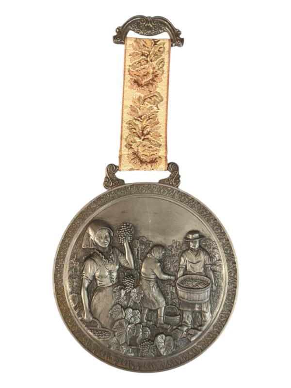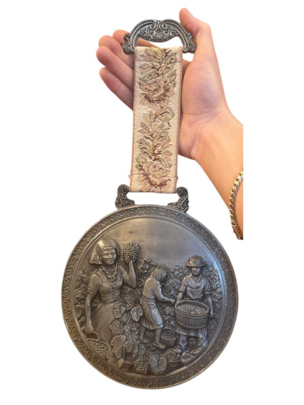 Avrupa Üretimi Zin Üzeri Kabartma Motifli Goblen Askılı Duvar Süsü 16,5 cm çapında 33 cm uzunluğunda
