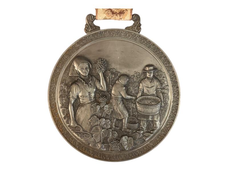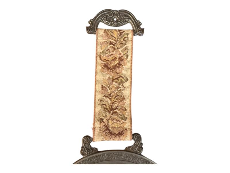 Avrupa Üretimi Zin Üzeri Kabartma Motifli Goblen Askılı Duvar Süsü 16,5 cm çapında 33 cm uzunluğunda başlıklı antika/koleksiyon objesi Avrupa menşe’lidir. Objenin ait olduğu dönem bilinmeketedir.