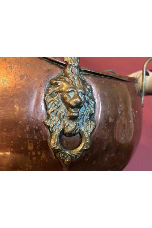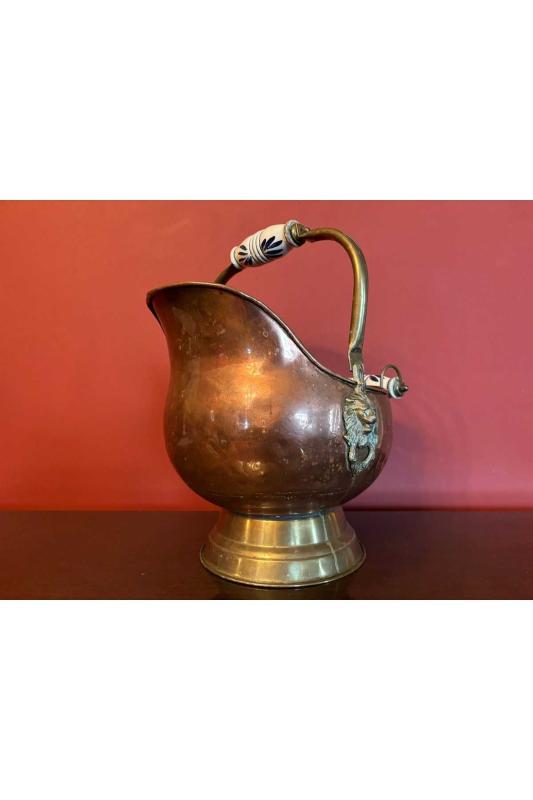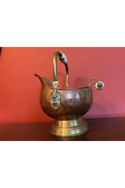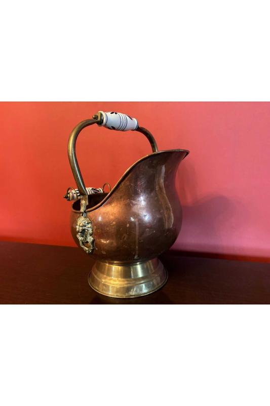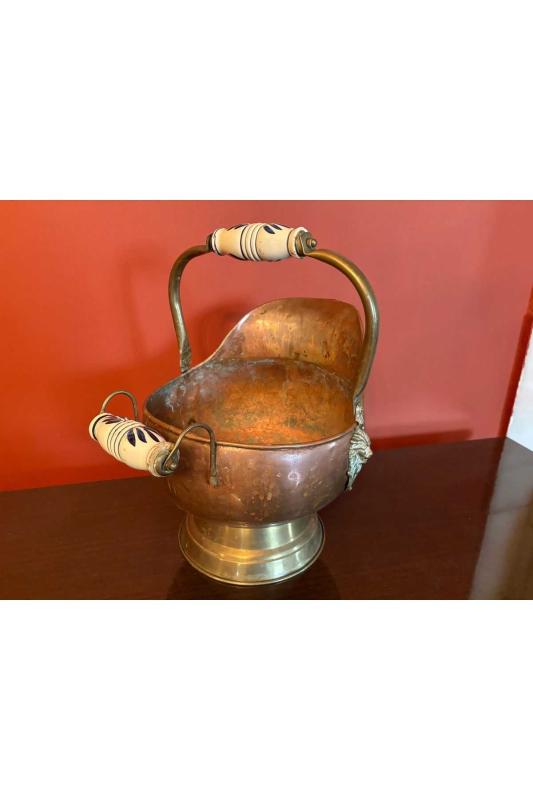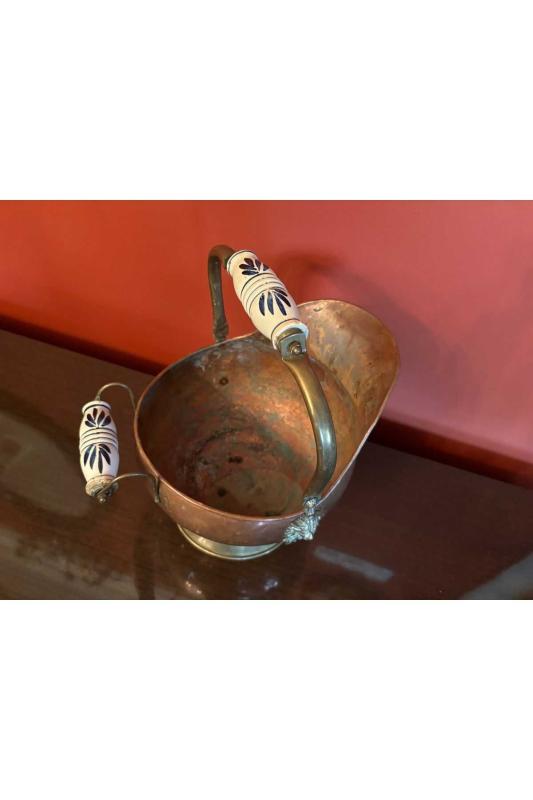 Avrupa bakır kömür kovası porselen kulplu 37 cm boyunda 25 cm çapında başlıklı antika/koleksiyon objesinin menşei belirtilmemiştir. Objenin ait olduğu dönem bilinmeketedir.