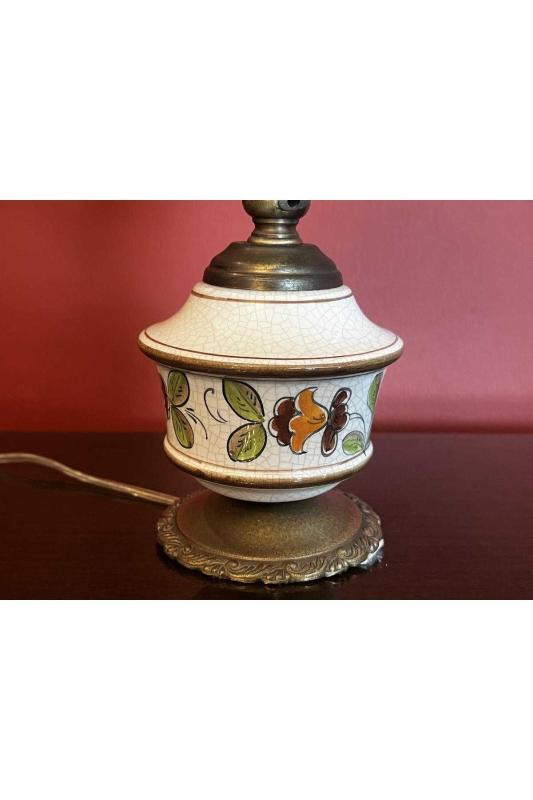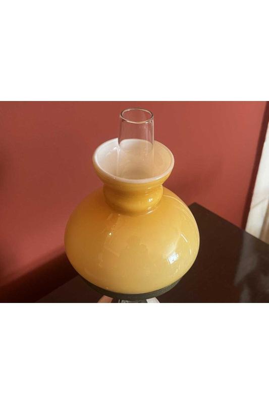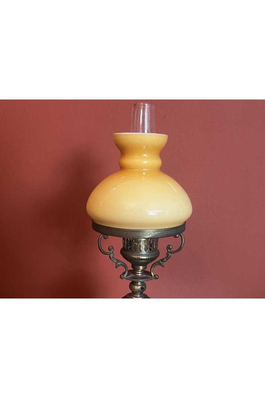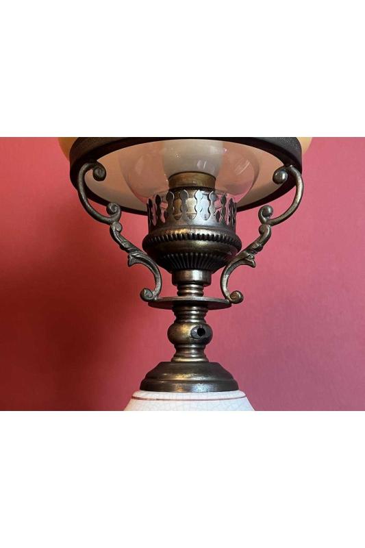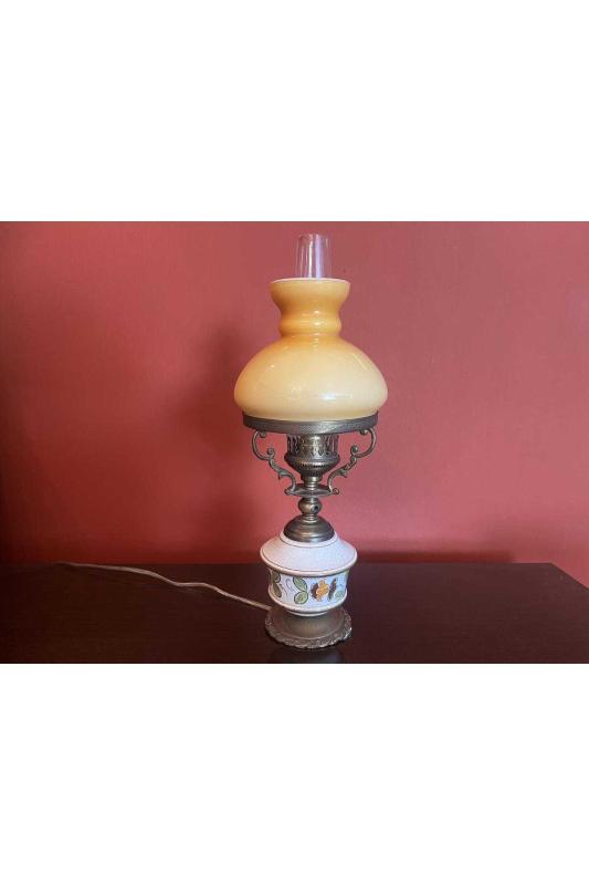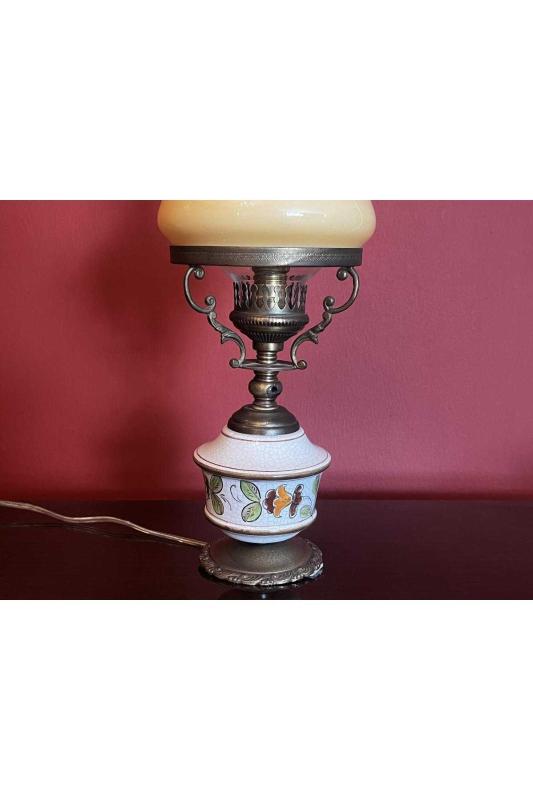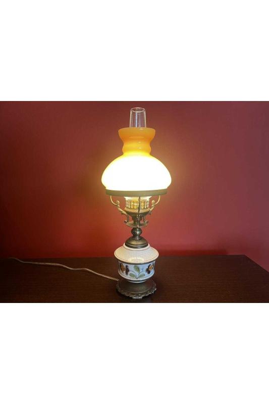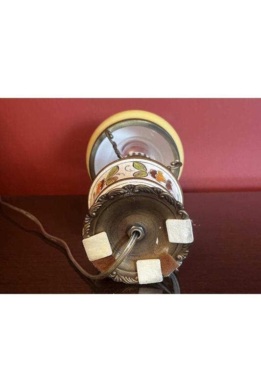 Avrupa opalin camlı pirinç ve seramik abajur 38 cm boyunda başlıklı antika/koleksiyon objesinin menşei belirtilmemiştir. Objenin ait olduğu dönem bilinmeketedir.