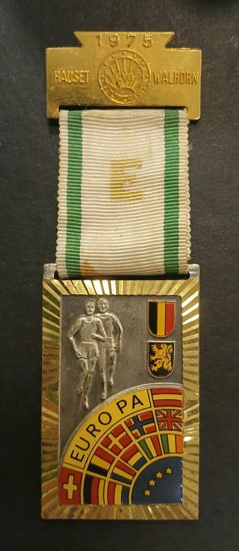Avrupa/Belçika, Lontzen Eupen Eyaleti BE/Eğlence Koşu Temalı Rozet-Madalya, 1975. Koşucular ve 12 Ülke Bayraklı Kabartma Tasarım/Renkli Mineli. Nadir. Altın Kaplama-Yüksek Kaliteli Metal. (37x116 mm)