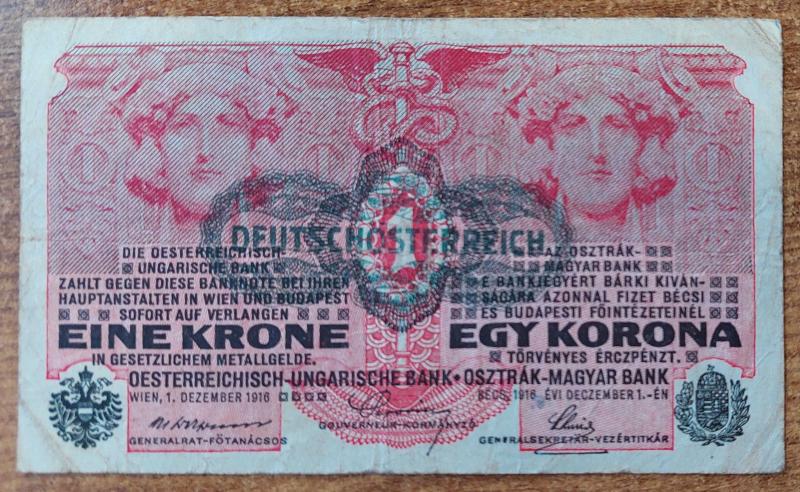 Avusturya, 1 Kronu Banknotu, Astro-Hungarian Bank 1916. Ön Yüz: İki Kadın Başı ve Asklep'in Asası Yer Almaktadır. Ayrıca Avusturya, Macaristan Armaları ve Yeşil "DEUTSCHÖSTERREICH" Yazısı Bulunmaktadır. Arka Yüz: Miğferli Bir Savaşçı Yer almaktadır. Nadir. (ÇT) Haliyle.