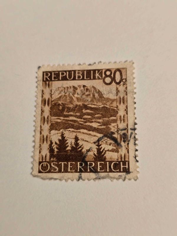 Bu pul, Avusturya Cumhuriyeti (Republik Österreich) tarafından basılmış 80 Groschen nominal değerli bir puldur. Pulun ana teması, Alp Dağları'nda bir kış manzarasıdır. Ön planda çam ağaçları ve karla kaplı bir vadi, arka planda ise yüksek, karlı dağ zirveleri (muhtemelen Grossglockner) görülmektedir. Bu, Avusturya'nın doğal güzelliklerini sergileyen popüler bir seri parçasıdır. Pulun üst kısmında "REPUBLIK 80g.", alt kısmında ise "ÖSTERREICH" yazmaktadır. Emisyon Yılı Bu pul, büyük olasılıkla 1945-1953 yılları arasında Avusturya'nın İkinci Cumhuriyeti döneminde çıkarılan ve "Manzara Serisi (Dauer-Manzara)" olarak bilinen seriye aittir. Serinin bu tür dağ ve çam ağacı motifleri, 1945'ten sonra sıkça kullanılmıştır.