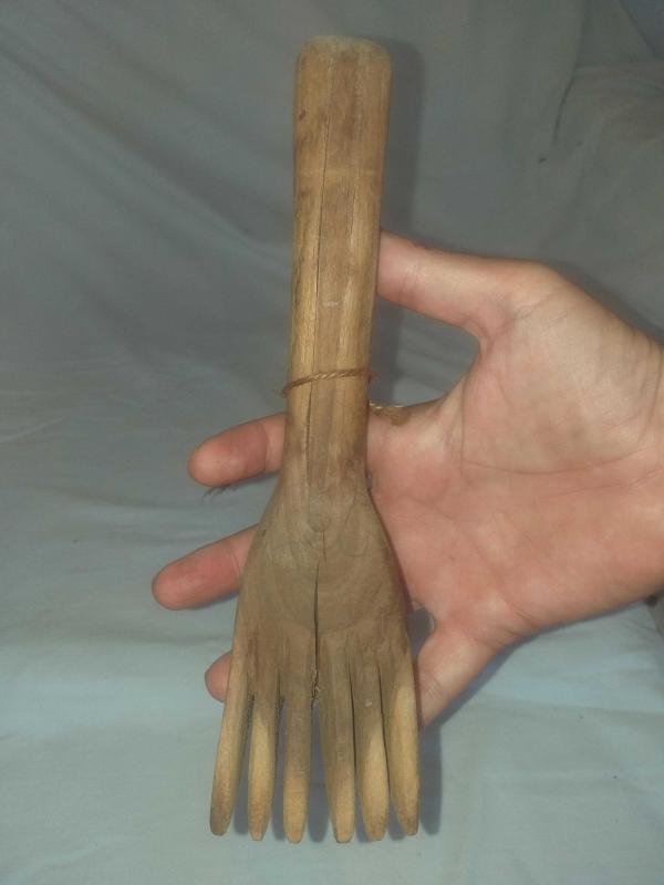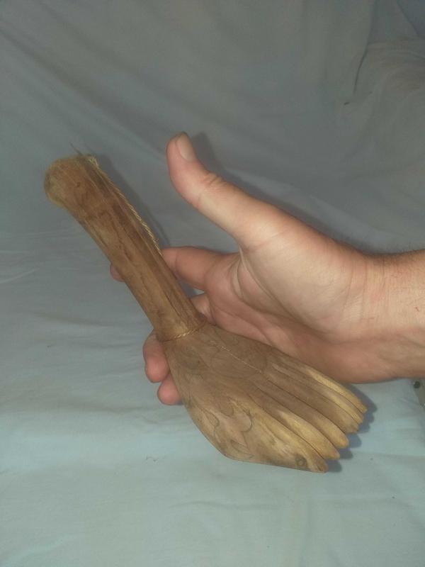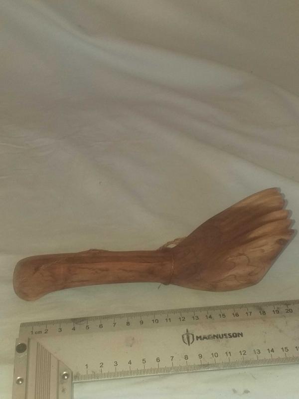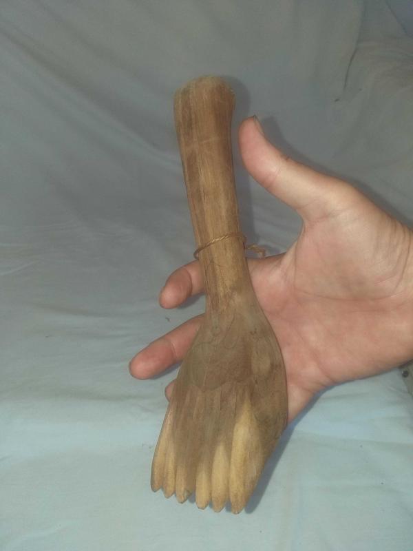 Dokuma işleri yapılırken ürün örgüsünü sıkılaştırmak için vurarak kullanılan ahşap alet... Ayak formunda , güzel patineli ahşap kirkit... Tekstil el aleti , ethnografik sanat , ethnografic art