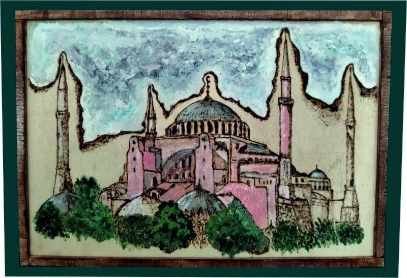 Ayasofya camii kebiri ahşap yakma tablo başlıklı antika/koleksiyon objesi Türkiye menşe’lidir. 2000 ve sonrası dönemine aittir.
