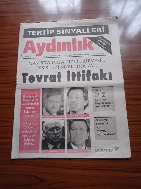 Aydınlık Gazetesi - 16 Ocak 2000 - Kurucusu Şefik Hüsnü - Devlet Bahçeli'yi MiT İkna Etti - Fethullah Gülen Başrol Recep Tayyip Erdoğan Arka Planda - Doğu Perinçek - Haftanın Konuğu Ayla Algan - Mayıs'ta Urfa Cizvit Zirvesi - Bakü Ceyhan Hattıyla Kurulan Büyük Tuzak Cento - Süleyman Demirel - Tony Blair - İlk Rockefeller Bursiyeri Bülent Ecevit adlı eser Türkçe dilindedir.