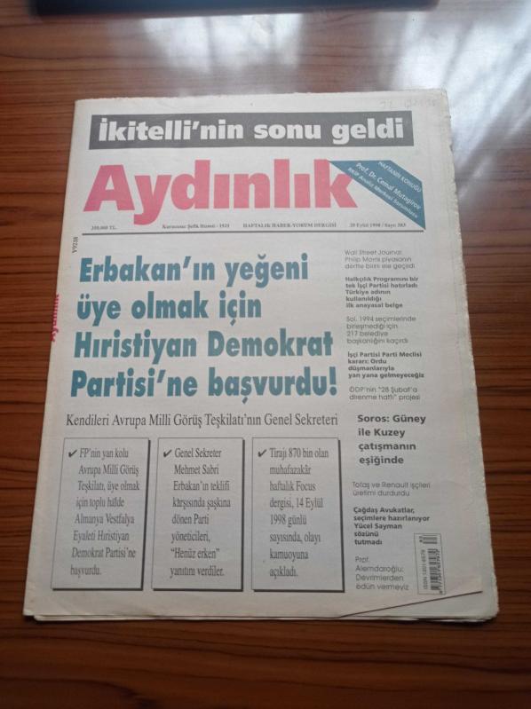 Aydınlık Gazetesi - 20 Eylül 1998 - Kurucusu Şefik Hüsnü - Doğu Perinçek - Haftanın Konuğu Profesör Doktor Cemal Mutagirov - Necmettin Erbakan'ın Yeğeni Üye Olmak İçin Hristiyan Demokrat Partisi'ne Başvurdu - Soros Güney İle Kuzey Çatışmanın Eşiğinde - Tofaş Ve Renault İşçileri Üretimi Durdurdu - Wall Street Journal Philip Morris Piyasanın Dörtte Birini Ele Geçirdi adlı eser Türkçe dilindedir.