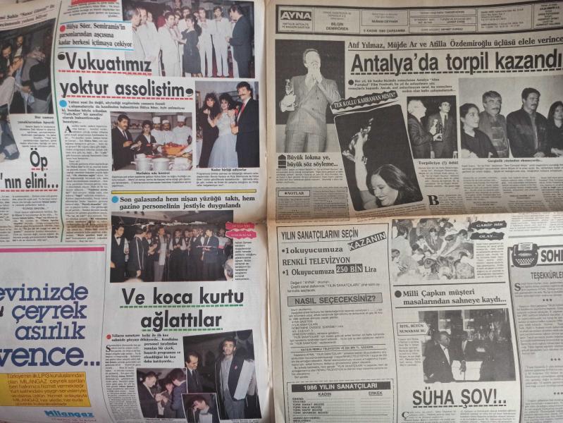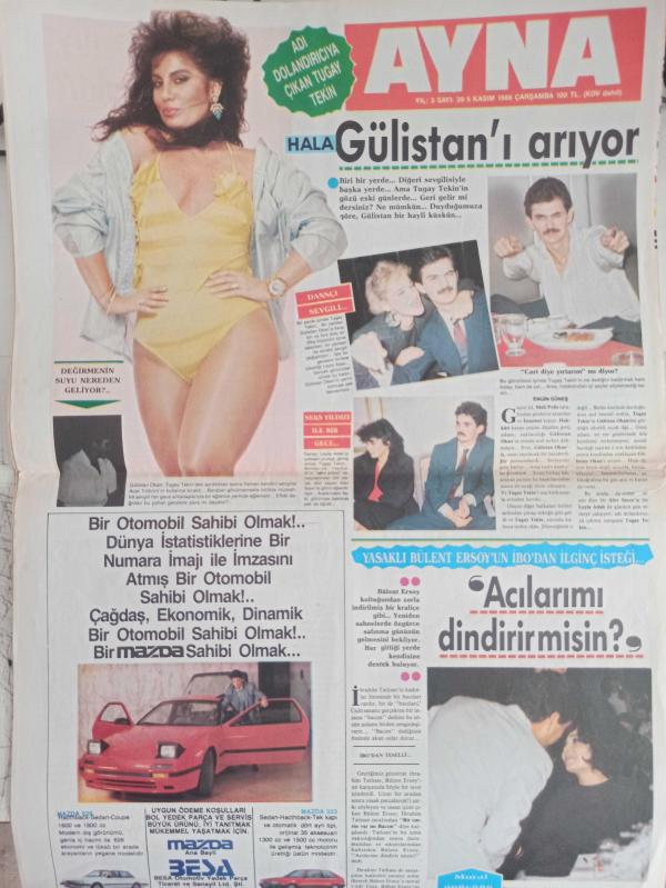 Ayna Gazetesi - 5 Kasım 1986 - Sayı:39 - Deniz Akbulut - Hasan Bora - Harika Avcı - Yüksel Uzel - Selami Şahin - Hülya Süer - Semiramis Pekkan - Zeki Müren - Sevda Karaca - Adnan Şenses - Müjde Ar - Kadir İnanr - Atıf Yılmaz - Müjde Ar - Atilla Özdemiroğlu - Romalı Peri Han - Levent Evrim - Meltem Doğanay - Müşerref Akay - İpek Erdem - Timur Erk - İpek Pınar - İzzet Altınmeşe- Ayşe Mine - Süha Kutlu - Sibel Egemen - Melike Zobu - Tuğrul Meteer - Tugay Tekin - Bülent Ersoy - İbrahim Tatlıses fotoğraf ve haberi - Tam Takım Gazete Yıpranma, sararmalar, kupon kesiği ve yırtılmalar zamana bağlı olarak görülebilir
