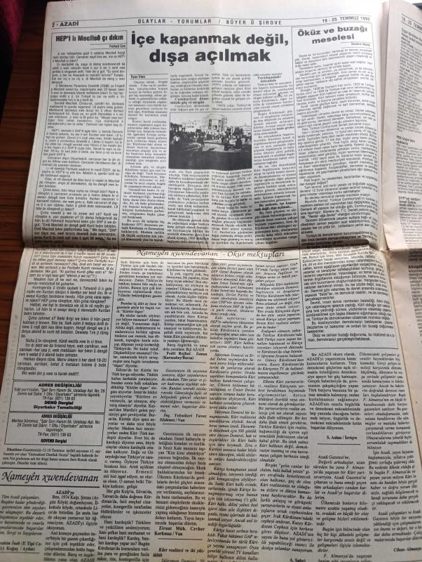 Azadi Gazetesi - Turkish Newspaper - 19 25 Mart 1992 - yürüdüler yemek boykotu yaptılar toplu vizeye çıktılar ve filli grev'e gittiler Fotoğrafı - HEP'i Meclisê çı dıkın nıvisi Ferhad Can - Avusturya Güney Kürdistan'ın Hewler kentindeki Avusturya Emine yapılan bombalı saldırıdan dolayı Irak'ı protesto etti - Şemdinli yine bombalandı - Didim Halk Kültür Derneği ile dayanışma gecesi - Kızıltepe peşmerge kampında olay - arkadaş kitabevine saldırı - iç Anadolu'da Kürtler yazan Ahmet Kızıl - Suruç belediye başkanı Salih Tekinalp - Sanıka Laze Pire û saye maran Zazaki - Said-i Nursi ve Kürt sorunu - Falxana Xalê Tosın - Çendo bextiyar karikatür - Helbestvaneki Cıwan İsmail Badi - HEP Diyarbakır İl Başkanı Hüseyin Turhallı - Newroz katliamı protestocuları yargılanıyor - Grup Ekin pavarotti'den de ikametgah ilmuhaber istiyor musunuz Fotoğrafı - insan hakları Derneği Genel sekreteri Akın Birdal Kürt sorunu en yaşamsal sorundur - evlilik hakkında kadınlar konuşuyor - Küba'da sosyalizm sürecek mi, Hikmet Çetin tarafından kaleme alınmıştır. Azadi Gazetesi - Turkish Newspaper - 19 25 Mart 1992 - yürüdüler yemek boykotu yaptılar toplu vizeye çıktılar ve filli grev'e gittiler Fotoğrafı - HEP'i Meclisê çı dıkın nıvisi Ferhad Can - Avusturya Güney Kürdistan'ın Hewler kentindeki Avusturya Emine yapılan bombalı saldırıdan dolayı Irak'ı protesto etti - Şemdinli yine bombalandı - Didim Halk Kültür Derneği ile dayanışma gecesi - Kızıltepe peşmerge kampında olay - arkadaş kitabevine saldırı - iç Anadolu'da Kürtler yazan Ahmet Kızıl - Suruç belediye başkanı Salih Tekinalp - Sanıka Laze Pire û saye maran Zazaki - Said-i Nursi ve Kürt sorunu - Falxana Xalê Tosın - Çendo bextiyar karikatür - Helbestvaneki Cıwan İsmail Badi - HEP Diyarbakır İl Başkanı Hüseyin Turhallı - Newroz katliamı protestocuları yargılanıyor - Grup Ekin pavarotti'den de ikametgah ilmuhaber istiyor musunuz Fotoğrafı - insan hakları Derneği Genel sekreteri Akın Birdal Kürt sorunu en yaşamsal sorundur - evlilik hakkında kadınlar konuşuyor - Küba'da sosyalizm sürecek mi adlı eser Türkçe dilindedir.