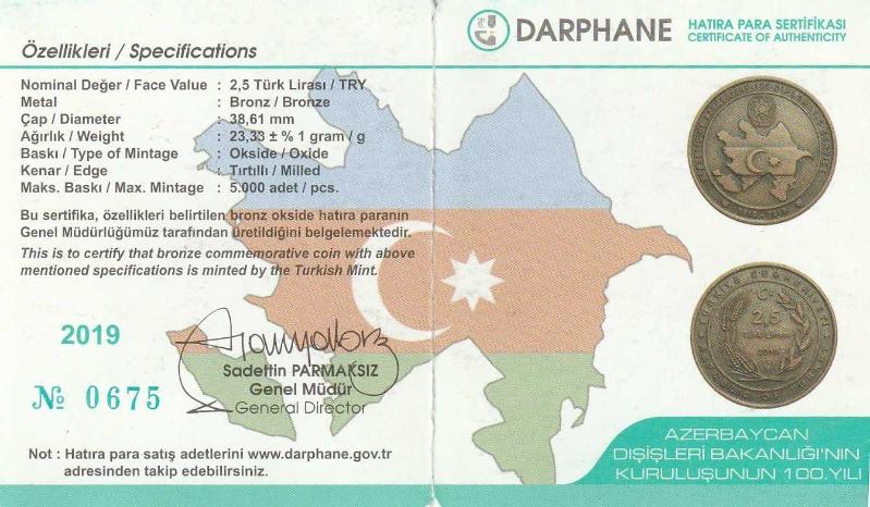 Azerbaycan Dışişleri Bakanlığının Kuruluşunun 100.Yılı Bronz Hatıra Para, Darphane SERTİFİKA NO: 2314 Sertifikası ortadan katlanmış kat izi var