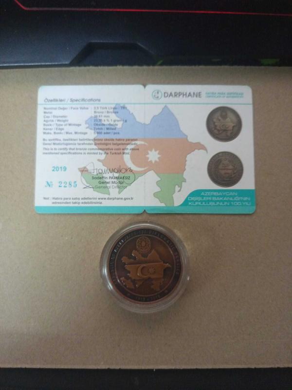 Azerbaycan Dışişleri Bakanlığı'nın Kuruluşunun 100. Yılı Hatıra Bronz Para Sertifikalı, en son 27 gün önce güncellenmiştir.