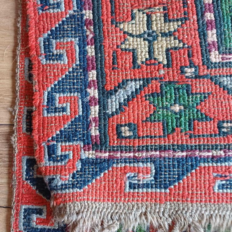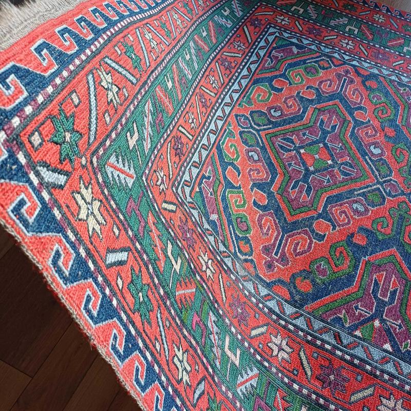 170 x 250 cm Azerbaycan tamamı Yün Kilim. İncecik. Yeşil kırmizı,gri,bej renklerde. 1980'ler. El dokuma.Kök boya. Saçaksız. Degisik bir dokumz teknigi var.Alttaki ipler görunuyor genel dokusunda. Oldugu hali ole fotograflanmis essiz bir guzelliktir.