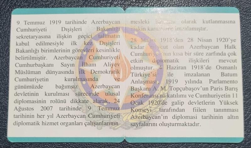 Azerbaycan dışişleri bakanlığının kuruluşunun 100 yılı anısına darphane tarafından üretilmiş bronz hatıra para. Koruma kurtusu mevcut değildir. Serfitika ile gönderilecektir.