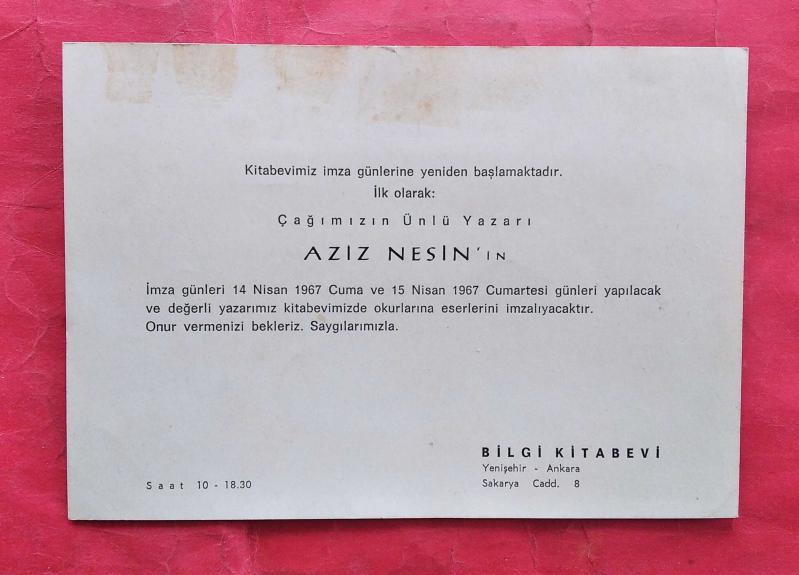 Aziz Nesin'in 14-15 Nisan 1967 Günü Ankara Bilgi Kitabevi'nde Düzenleyeceği İmza Günü Davetiyesi, en son 2 yıl önce güncellenmiştir.