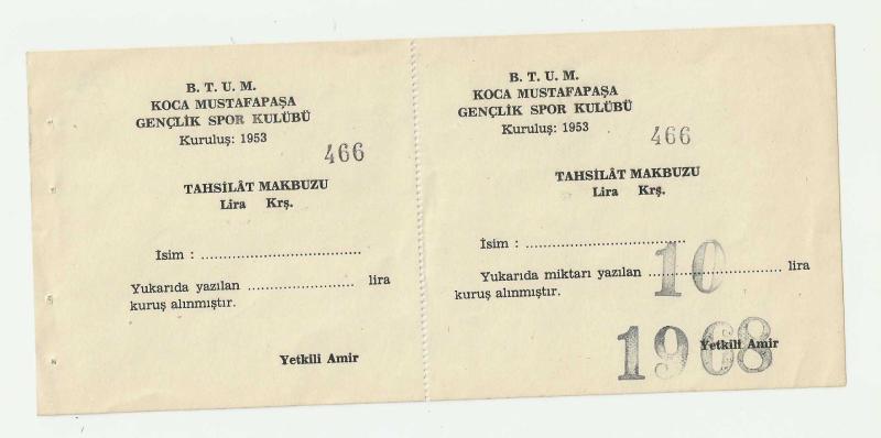 ** B.T.U.M.KOCAMUSTAFAPAŞA GENÇLİK SPOR KULÜBÜ TAHSİLAT MAKBUZU ** 1968 yılına ait ancak hiç kullanılmamış boş makbuzdur...
