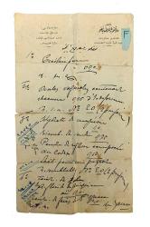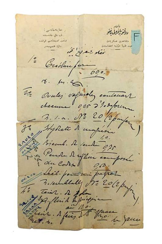 BAFRALI YANKO (Rum asıllı Osmanlı doktor, Yozgat Seyahatnamesi’nin yazarı) (?-1936) Islak imzalı, Osmanlıca antetli kağıda, tamamı Fransızca / Osmanlıca el yazması, 1893/94 tarihli reçete, bir ay önce satışa sunulmuştur.