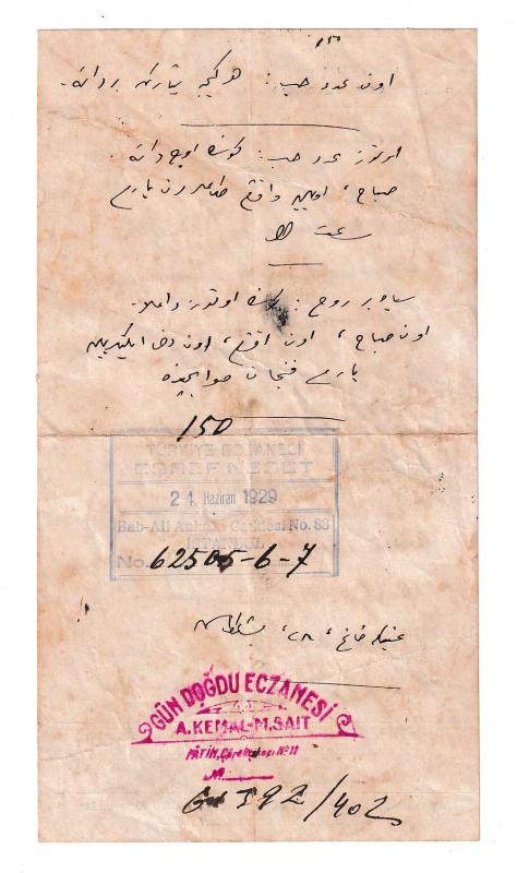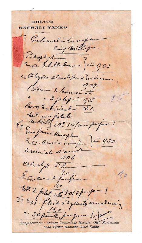 “Yanko” imzalı orijinal el yazısı reçete (Osmanlıca antetli). 20 x 11 cm. İlaç isimleri Latin harfleriyle (Fransızca?), basılı antet Yeni Türkçe (Latin harfli) ve arkadaki boşlukta ilaçların kullanımı Osmanlıca ile yazılmıştır. 2 sayfa. Arka yüzde muhtemelen ilâçların hasta tarafından temin edildiği eczane kaşesi bulunuyor (2 adet). Kâğıt üzerinde hafif lekeler mevcut. Yine de iyi durumda bir evrak. Eczane kaşelerinden birinde (Türkiye Eczaneci Eşref Neşet) 1929 tarihi mevcuttur. Reçetede Yanko’nun, Ankara Caddesi’nde Meserret Oteli karşısında Esad Efendi Hanında ikinci katta muayenehanesi olduğu belirtilmektedir. Babıâli’de Kanaat Yayınevi karşısındaki muayenehanesinden taşındığı böylelikle anlaşılmaktadır. Bafralı Dr. Yanko, hekimliğinin yanı sıra siyasi makaleler, edebî hikâyeler, çeviriler ve tıpla ilgili kitaplar ile yazma eserler kaleme alan Osmanlı / Türk tarihçilerindendir. Bafralı Orduluoğlu adıyla da bilinen Dr. Yanko, Bab-ı Vâlâ-yı Seraskerî Hastanesi’nde görev yaptı ve 1867’de kurulan, dönemin tıp cemiyeti olan Cemiyet-i Tıbbiye-i Osmaniye’nin üyesiydi. Bu kuruluş günümüzde Tıp Akademisi olarak bilinmektedir. Yanko’nun adı cemiyetin 1867-1911 yıllarına ait kayıtlarında geçmektedir. Ayrıca Türkiye’de yayımlanan ilk pediatri dergisi **“Emraz-ı Pediatri”**nin yayın kurulunda yer aldı; Mahmudiye Caddesi, No: 22’deki muayenehanesinde hastalarını kabul etti. Tabip yarbay rütbesiyle emekliye ayrılan Dr. Yanko, 28 Aralık 1936’da İstanbul’da vefat etti. Bunun dışında, 1889’da (H. 1306) yayımlanan “Yozgat Seyahatnamesi” adlı gezi hatıralarını kaleme almıştır. (Kaynak: Dr. Yanko of Bafra and His Yozgat Journey Book, Muammer Ulutürk).