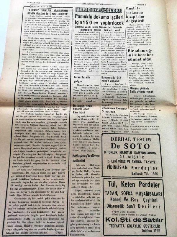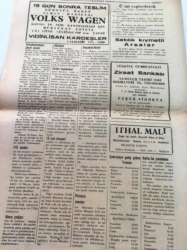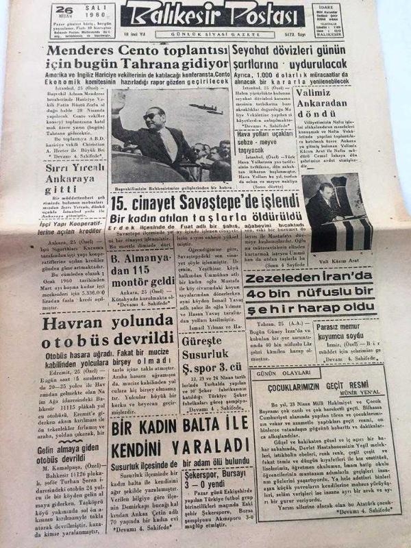 BALIKESİR BALIKESİR POSTASI YEREL TAŞRA BASINI --26 Nisan 1960 YIL:18 SAYI :5172- Menderes Cento Toplantısı İçin Bugün Tahran 'a Gidiyor -Sırrı Yırcalı Ankara'ya Gitti-15. Cinayet Savaştepe 'de İşlendi Bir kadın atılan taşlarla öldürüldü --Havran yolunda otobüs devrildi --Seyahat dövizleri günün şartlarına uydurulacak -Zezeleden İran da 40 bin Nüfuslu bir şehir harap oldu ---Çocuklarımızın Geçit Resmi Münir Yenal --Vali Kazım Arat Ankara dan Dönüyor --Faydasız sayılan bilgilerden büyük ölçüde istifade ediliyor - Pamuklu dokuma işçileri için 150 ev yaptırılacak --Bozulan ciltlerin düzeltmek kabil fakat önce sabır lazım --Tokyo da eski Türk sanat eserleri sergisi açıldı -Türkiye büyük hamleler kaydeden bir memlekettir -- Yıpranma, sararmalar, kupon kesiği ve yırtılmalar zamana bağlı olarak görülebilir.
