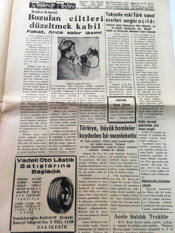 BALIKESİR BALIKESİR POSTASI YEREL TAŞRA BASINI --26 Nisan 1960 YIL:18 SAYI :5172- Menderes Cento Toplantısı İçin Bugün Tahran 'a Gidiyor -Sırrı Yırcalı Ankara'ya Gitti-15. Cinayet Savaştepe 'de İşlendi Bir kadın atılan taşlarla öldürüldü --Havran yolunda otobüs devrildi --Seyahat dövizleri günün şartlarına uydurulacak -Zezeleden İran da 40 bin Nüfuslu bir şehir harap oldu ---Çocuklarımızın Geçit Resmi Münir Yenal --Vali Kazım Arat Ankara dan Dönüyor --Faydasız sayılan bilgilerden büyük ölçüde istifade ediliyor - Pamuklu dokuma işçileri için 150 ev yaptırılacak --Bozulan ciltlerin düzeltmek kabil fakat önce sabır lazım --Tokyo da eski Türk sanat eserleri sergisi açıldı -Türkiye büyük hamleler kaydeden bir memlekettir --, MÜNİR YENAL tarafından kaleme alınmıştır. Kitap 1942 yılında [TÜRK PAZARI MATBAASI ] yayınlanmıştır. 4 sayfadır. BALIKESİR BALIKESİR POSTASI YEREL TAŞRA BASINI --26 Nisan 1960 YIL:18 SAYI :5172- Menderes Cento Toplantısı İçin Bugün Tahran 'a Gidiyor -Sırrı Yırcalı Ankara'ya Gitti-15. Cinayet Savaştepe 'de İşlendi Bir kadın atılan taşlarla öldürüldü --Havran yolunda otobüs devrildi --Seyahat dövizleri günün şartlarına uydurulacak -Zezeleden İran da 40 bin Nüfuslu bir şehir harap oldu ---Çocuklarımızın Geçit Resmi Münir Yenal --Vali Kazım Arat Ankara dan Dönüyor --Faydasız sayılan bilgilerden büyük ölçüde istifade ediliyor - Pamuklu dokuma işçileri için 150 ev yaptırılacak --Bozulan ciltlerin düzeltmek kabil fakat önce sabır lazım --Tokyo da eski Türk sanat eserleri sergisi açıldı -Türkiye büyük hamleler kaydeden bir memlekettir -- adlı eser Türkçe dilindedir.