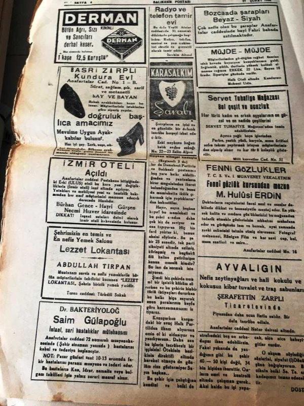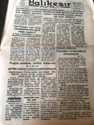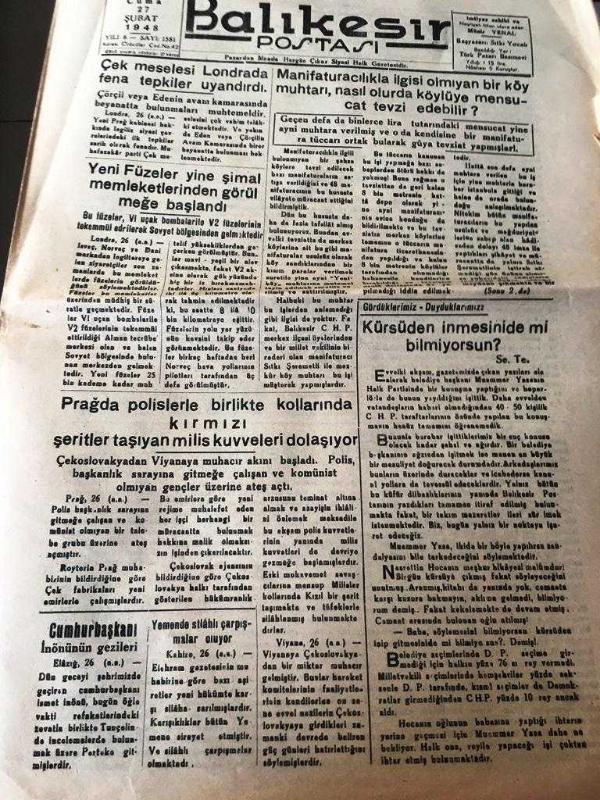 BALIKESİR BALIKESİR POSTASI YEREL TAŞRA BASINI - 27 Şubat 1948 YIL :6 SAYI :1581- Çek meselesi Londra da fena tepkiler uyandırdı - Yeni füzeler yine şimal memleketlerinden görülmeğe başlandı - Manifaturacılıkla ilgisi olmayan bir köy muhtarı nasıl olurda köylüye mensucat tevzi edebilir - -Halkevi üzerine :yazan H.Bozkurt - lisede Mehmet Akif Günü -DP Eşya Piyangosu Biletleri Satışa Çıkarıldı -Balıkesir Örmeciler Küçük Sanat Kooperatifinden - Yıpranma, sararmalar, kupon kesiği ve yırtılmalar zamana bağlı olarak görülebilir.