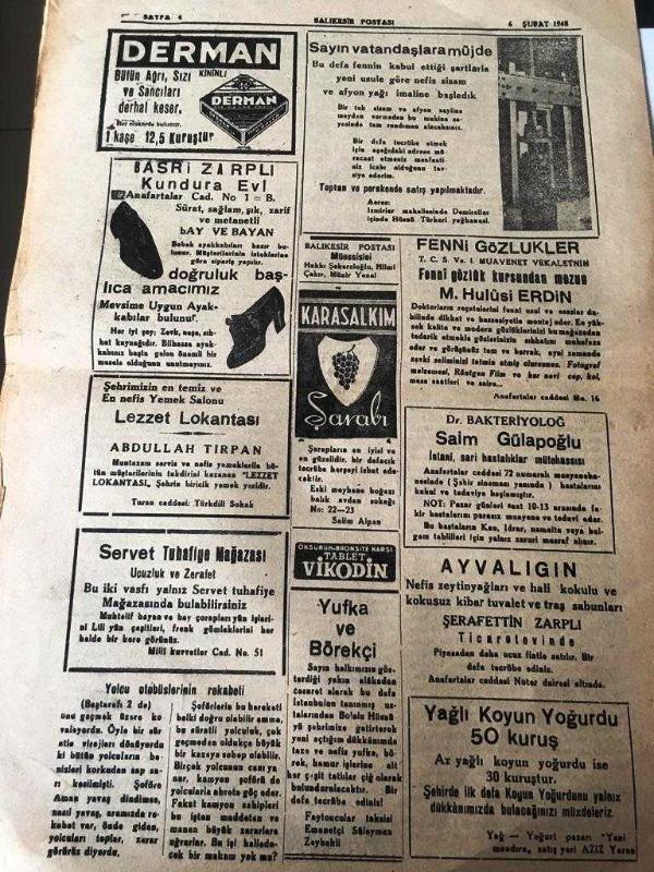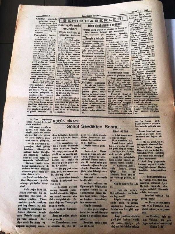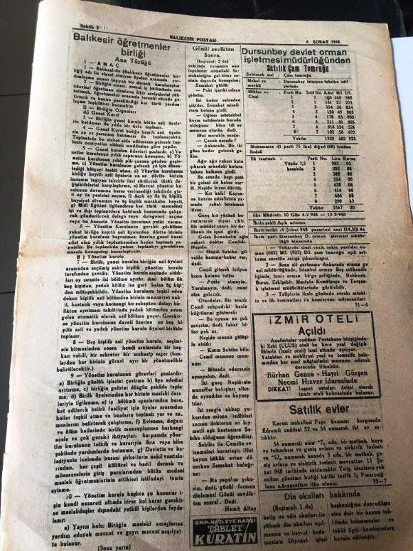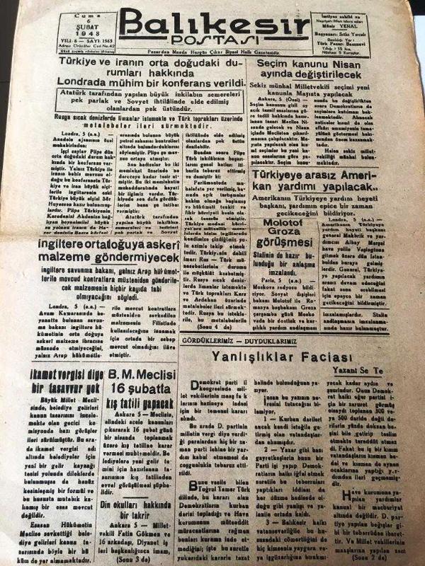 BALIKESİR POSTASI GAZETESİ YEREL TAŞRA BASINI ----6 Şubat 1948 Yıl :6 Sayı :1563---Türkiye Ve İran 'ın orta doğudaki durumları hakkında Londra da mühim bir konferans verildi --Seçim kanunu nisan ayında değiştirilecek -- Türkiye arasız Amerika Yardımı Yapılacak --Küçük Hikaye :Gönül Sevdikten Sonra :Hamit Altay --Dursunbey devlet orman işletmesi müdürlüğünden --Dr .Bakteriyolog :Saim Gülapoğlu -- Yıpranma, sararmalar, kupon kesiği ve yırtılmalar zamana bağlı olarak görülebilir.