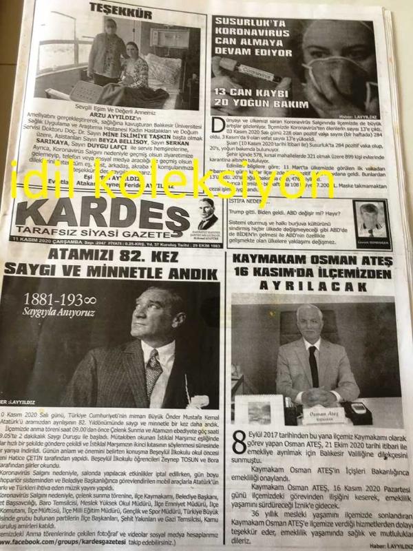 BALIKKESİR KARDEŞ TARAFSIZ SİYASİ GAZETE YEREL TAŞRA BASINI ---11 Kasım 2020 Sayı :2047 --Atamızı 82. Kez Saygı ve Minnetle Andık --Susurluk 'ta Koronavirüs Can Almaya Devam Ediyor 13 Can Kaybı 20 Yoğun Bakımı--Kaymakam Osman Ateş 16 Kasım da İlçemizden Ayrılacak --İstifa neden :Levent Gündoğan --Tarihi İzinde Susurluk :Yücel Kılıç --Deprem ve Gözlemlerim :Eşref Kalaycı -- Yıpranma, sararmalar, kupon kesiği ve yırtılmalar zamana bağlı olarak görülebilir.