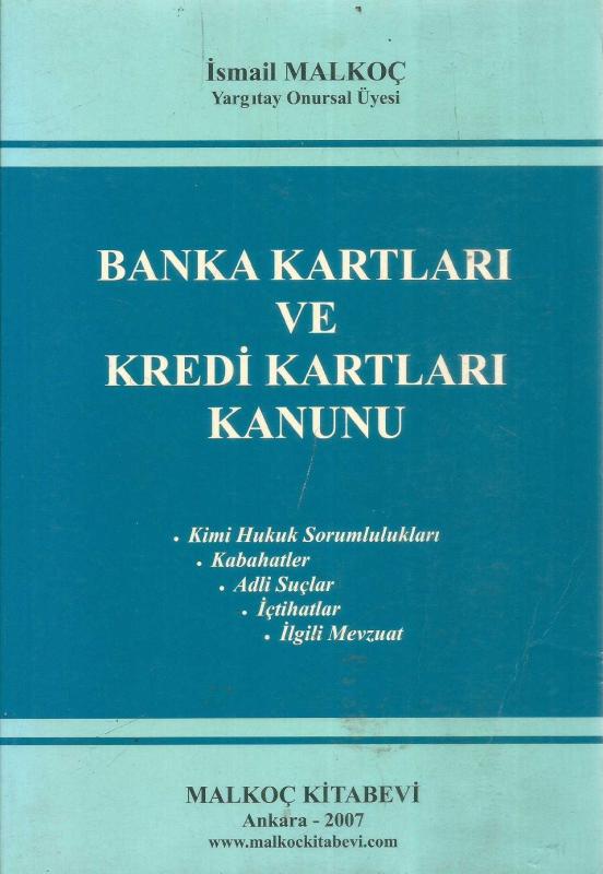 BANKA KARTLARI VE KREDİ KARTLARI KANUNU, İSMAİL MALKOÇ tarafından kaleme alınmıştır. Kitap 2007 yılında MALKOÇ tarafından yayınlanmıştır. 614 sayfadır. BANKA KARTLARI VE KREDİ KARTLARI KANUNU adlı eser Türkçe dilindedir.