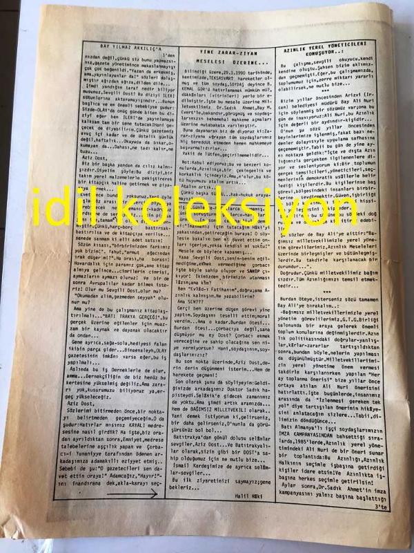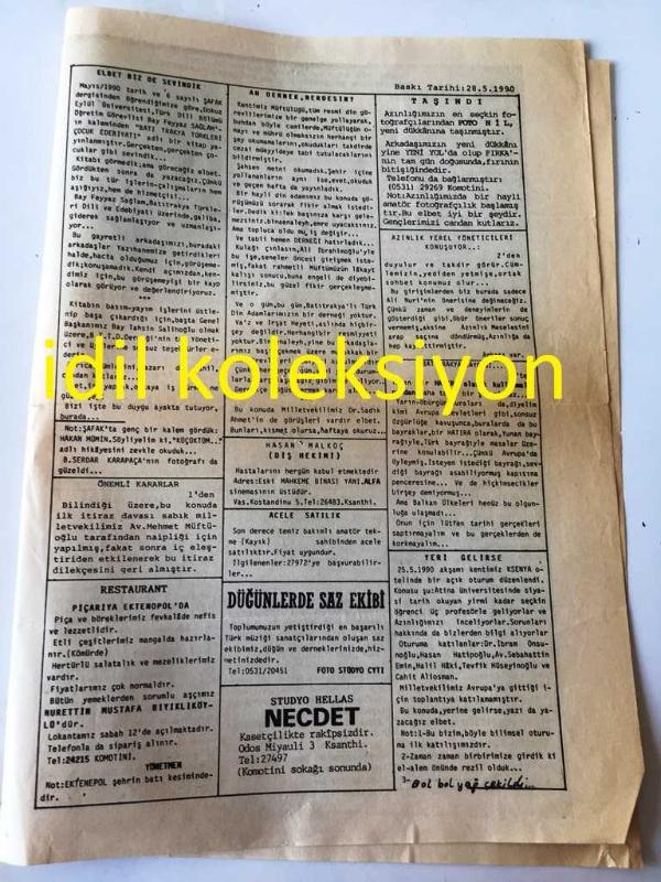 BATI TRAKYA , YUNANİSTAN İLERİ GAZETESİ YEREL TAŞRA BASINI - ---1 Haziran 1990 Yıl :16 Sayı :598--Bay Yılmaz Akkılıç 'a Olay Gazetesi--Türkiye Hazır Yeni Bir Atatürk Venizelos Dostluğuna Doğru Mu ?--Azınlık yerel yöneticileri konuşuyor--Yine zarar ziyan meselesi üzerine :Halil Haki--Hasan Malkoç :Diş Hekim--Bağımsız Milletvekilimiz Dr. Sadık Ahmet -- Yıpranma, sararmalar, kupon kesiği ve yırtılmalar zamana bağlı olarak görülebilir.