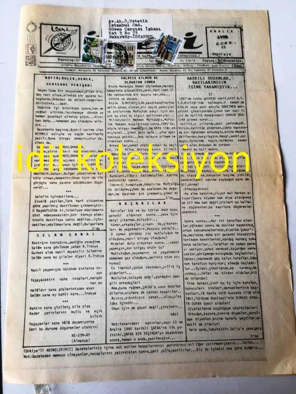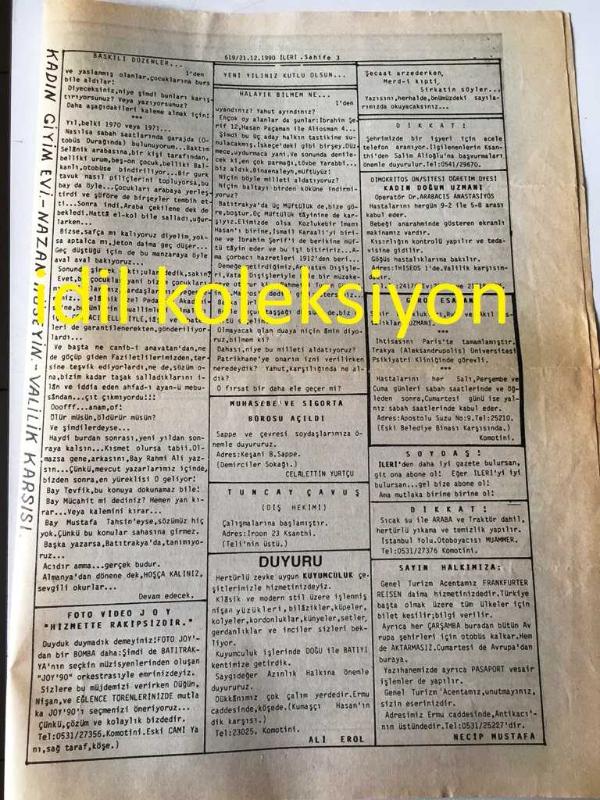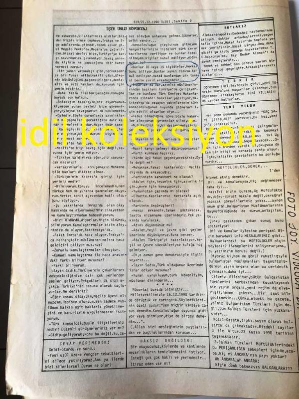 BATI TRAKYA , YUNANİSTAN İLERİ GAZETESİ YEREL TAŞRA BASINI - ---21 Aralık 1990 Sayı :619---Müftülükler Demek Her Yerde Perişan ---Halayık Bilmen Ne Olduktan Sonra --Baskılı Düzenler Bazılarımızın İşine Yaramıştır --İşte Ünlü Röportaj --Tuncay Çavuş :Diş Hekimi--Razgrad Türk Cumhuriyeti Kuruldu-- Yıpranma, sararmalar, kupon kesiği ve yırtılmalar zamana bağlı olarak görülebilir.