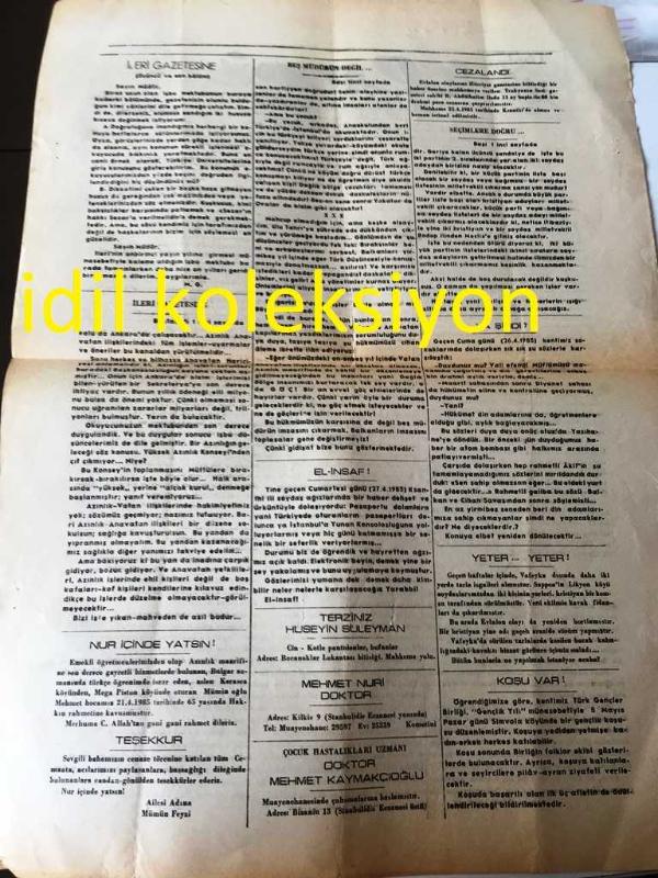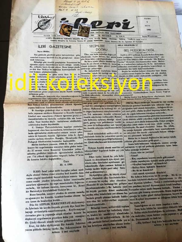BATI TRAKYA , YUNANİSTAN İLERİ GAZETESİ YEREL TAŞRA BASINI - ---3 Mayıs 1985--İleri Gazetesine--Seçimlere Doğru --Beş Müdürün Değil--Mehmet Nuri :Doktor-- Yıpranma, sararmalar, kupon kesiği ve yırtılmalar zamana bağlı olarak görülebilir.
