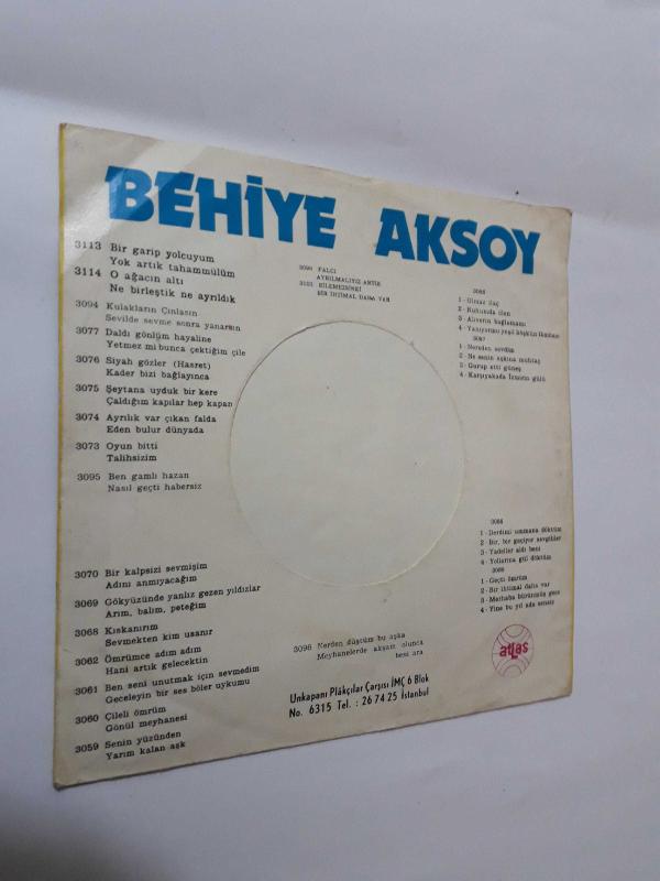 BEHİYE AKSOY - BİR GARİP YOLCUYUM * O AĞACIN ALTI - 45'LİK PLAK KABI (SADECE KABIDIR) başlıklı antika/koleksiyon objesinin menşei belirtilmemiştir. Objenin ait olduğu dönem bilinmeketedir.