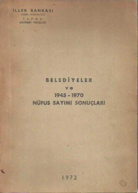 Kitap 1972 yılında İLLER BANKASI tarafından [ANKARA] yayınlanmıştır. BELEDİYELER VE 1945 - 1970 NÜFUS SAYIMI SONUÇLARI adlı eser Türkçe dilindedir.