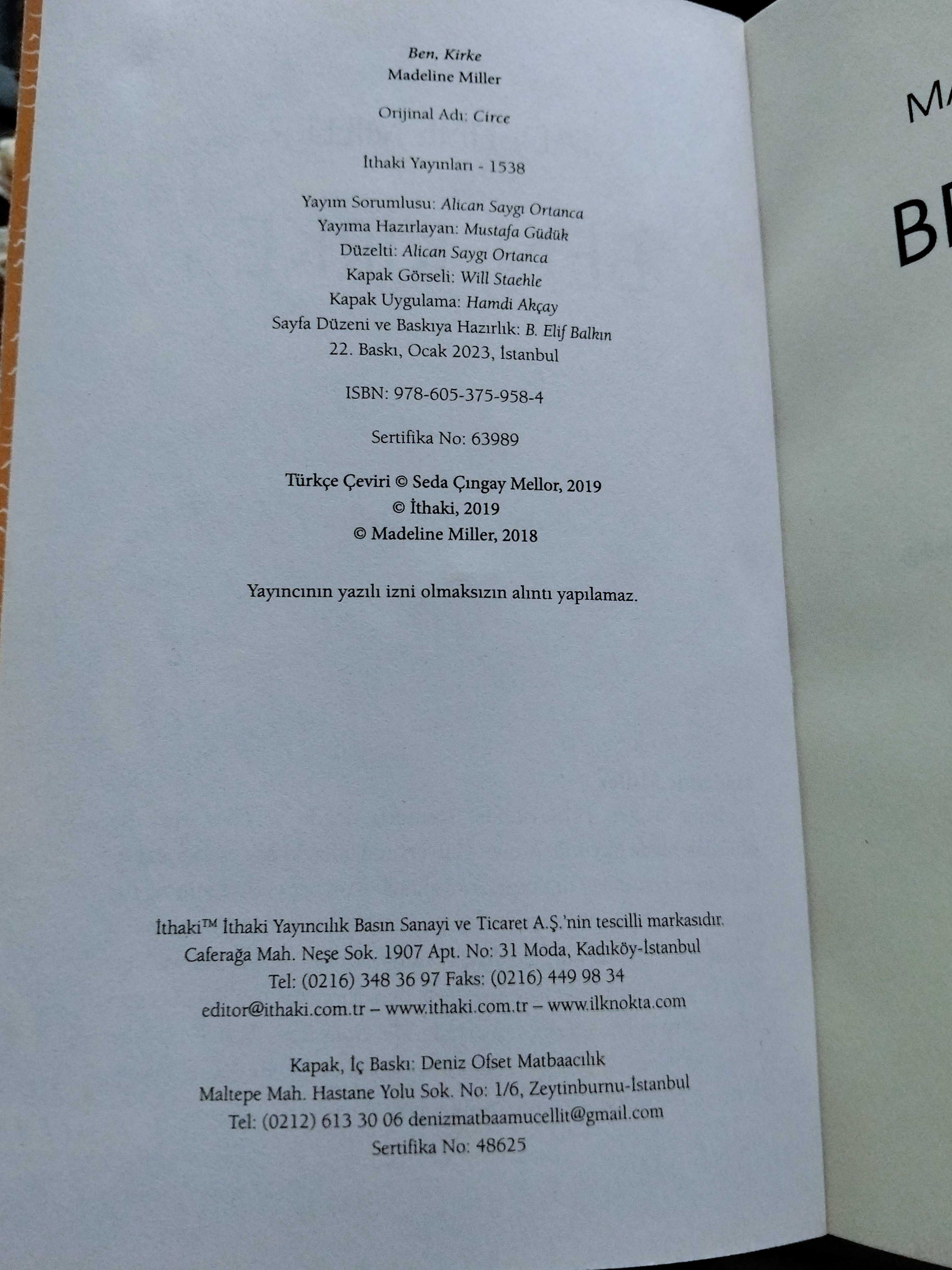 BEN,KİRKE, Madeline MILLER tarafından kaleme alınmıştır. Kitap 2023 yılında İTHAKİ YAYINEVİ tarafından [İstanbul] 9786057762931 ISBN kodu ile yayınlanmıştır. Bu baskının çevirisi Seda Çıngay MELLOR tarafından yapılmıştır. 408 sayfadır. BEN,KİRKE adlı eser Türkçe dilindedir.
