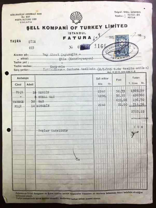 BENZİN, GAZ, MOTORİN FATURASI - 10 MAYIS 1955 - SHELL/ŞELL KOMPANİ OF TURKEY LİMİTED - ASİKURAZİONİ GENERALİ HAN, GALATA, İSTANBUL - AHMET ÇAYIROĞLU, ŞİLE - ISLAK İMZALI, KAŞELİ DAMGA PULU - 28 x 21 cm EBATLI ORİJİNAL FATURA, en son 1 yıl önce güncellenmiştir.