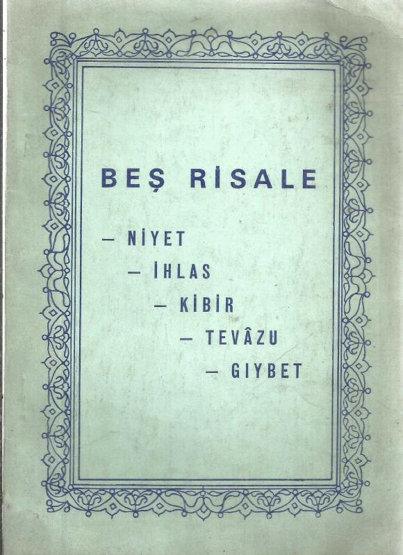 BEŞ RİSALE (NİYET, İHLAS, KİBİR, TEVAZU, GIYBET), - tarafından kaleme alınmıştır. Eser A. EROL editörlüğünde hazırlanmıştır. Kitap ÖZTÜRK MATBAASI tarafından [ANKARA] yayınlanmıştır. 51 sayfadır. BEŞ RİSALE (NİYET, İHLAS, KİBİR, TEVAZU, GIYBET) adlı eser Türkçe dilindedir.
