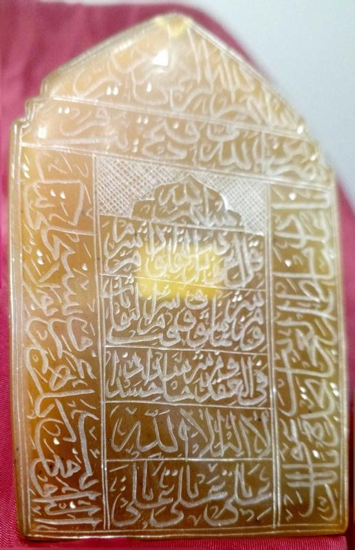 BESMELE VE FETİH SURESİ'NDEN BİR ALINTI İLE KUR'AN'DAN AYETLERİN YER ALDIĞI YAZILI DOĞAL AKİK TAŞI başlıklı antika/koleksiyon objesinin menşei belirtilmemiştir. Objenin ait olduğu dönem bilinmeketedir.