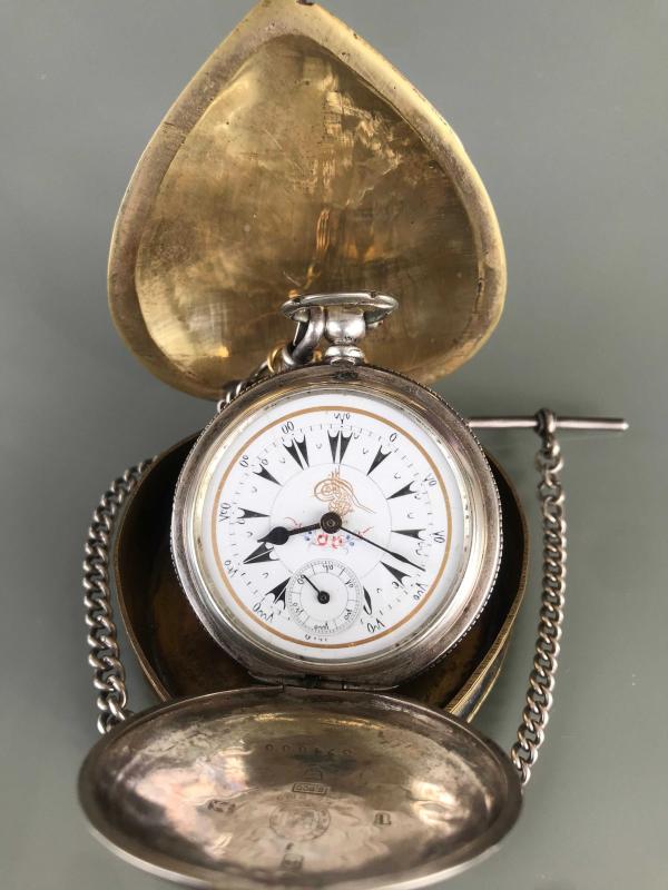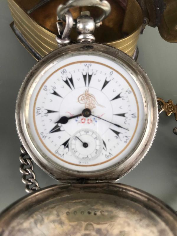 Ürünü Gümrükten aldım Osmanlı pazarı için üretilmiş kadranında tuğra olan çiçeklerle süslenmiş kusursuz emaye kadranlı çalışır durumda Damgalı 800 ayar gümüş kasa ve kapaklar Prinç'ten özel el yapımı muhafaza kutusunda çelik zincir köstekli kapaklarda ve makinede Billodes damgaları olan menteşeleri kusursuz durumda taşları yakuttan tarihin izlerini taşıyan çok güzel bir antika cep saati