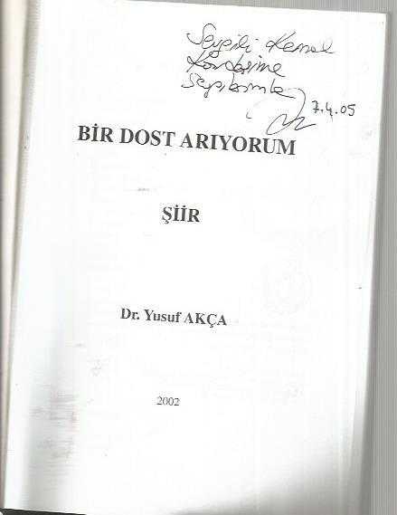 BİR DOST ARIYORUM (İMZALI), DR. YUSUF AKÇA tarafından kaleme alınmıştır. Kitap 2002 yılında [İSTANBUL ] yayınlanmıştır. 118 sayfadır. BİR DOST ARIYORUM (İMZALI) adlı eser Türkçe dilindedir.