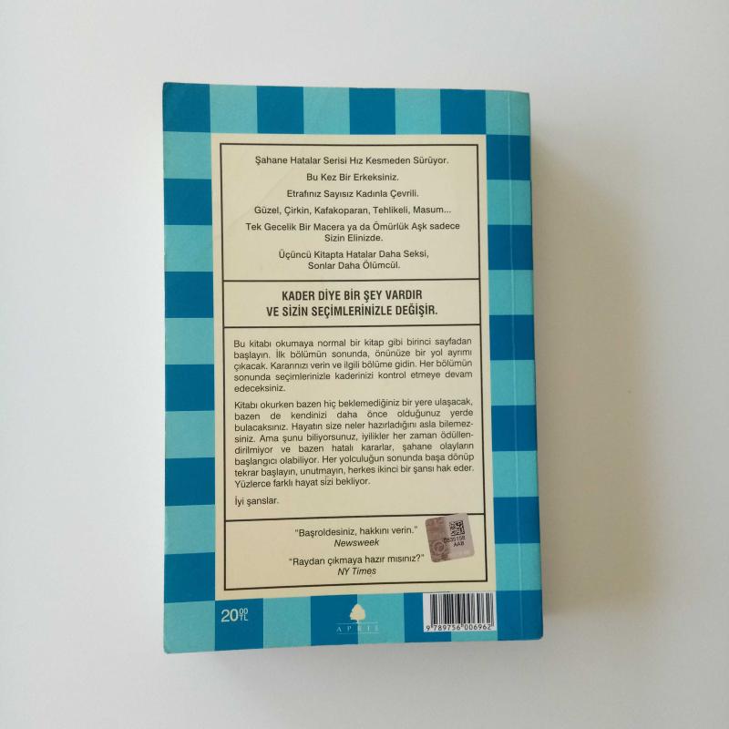 Şahane hatalar serisi hız kesmeden sürüyor: Bu kez bir erkeksiniz. Etrafınız sayısız kadınla çevrili. Güzel, çirkin, kafakoparan, tehlikeli, masum... Tek gecelik bir macera ya da ömürlük aşk sadece sizin elinizde. Üçüncü kitapta hatalar daha seksi, sonlar daha ölümcül. Kader diye bir şey vardır ve sizin seçimlerinizle değişir. Bu kitabı okumaya normal bir kitap gibi birinci sayfadan başlayın. İlk bölümün sonunda, önünüze bir yol ayrımı çıkacak. Kararınızı verin ve ilgili bölüme gidin. Her bölümün sonunda seçimlerinizle kaderinizi kontrol etmeye devam edeceksiniz. Kitabı okurken bazen hiç beklemediğiniz bir yere ulaşacak, bazen de kendinizi daha önce olduğunuz yerde bulacaksınız. Hayatın size neler hazırladığını asla bilemezsiniz. Ama şunu biliyorsunuz: iyilikler her zaman ödüllendirilmiyor ve bazen hatalı kararlar, şahane olayların başlangıcı olabiliyor. Her yolculuğun sonunda başa dönüp tekrar başlayın, unutmayın, herkes ikinci bir şansı hak eder. Yüzlerce farklı hayat sizi bekliyor. İyi şanslar. Başroldesiniz, hakkını verin. Newsweek Raydan çıkmaya hazır mısınız? NY Times