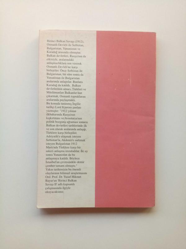 Birinci Balkan Savaşı (1912), Osmanlı Devleti ile Sırbistan, Bulgaristan, Yunanistan ve Karadağ arasında olmuştur. Balkan devletleri, Rusya'nın da etkisiyle, aralarındaki anlaşmazlıklara son vererek Osmanlı Devleti'ne karşı birleştiler. Önce Sırbistan ile Bulgaristan, bir süre sonra da Yunanistan ile Bulgaristan aralarında anlaştılar. Bunlara Karadağ da katıldı. Balkan devletlerinin amacı, Türkleri ve Müslümanları Balkanlar'dan çıkarmak, Osmanlı topraklarını aralarında paylaşmaktı. Bu konuda tanınmış İngiliz tarihçi Lord Kinross şunları yazmıştır: "1912 yılının ilkbaharında Rusya'nın kışkırtması ve Avusturya'nın politik bozguna uğraması sonucu Balkan devletleri tarihlerinde ilk ve son olarak aralarında anlaşıp, Türklere karşı birleştiler. Adriyatik'e ulaşmak isteyen Sırbistan'la, Akdeniz'e sarkmak isteyen Bulgaristan 1912 Martı'nda Türklere karşı bir askeri anlaşma imzaladılar. İki ay sonra Yunanistan da bu anlaşmaya katıldı. Böylece İstanbul'un çevresindeki demir çember tamam olmuştu." Yakın tarihimizin bu önemli olaylarının bilimsel araştırmasını Ord. Prof. Dr. Yusuf Hikmet Bayur'un 'Birinci Balkan Savaşı II' adlı kapsamlı çalışmasında ilgiyle okuyacaksınız.