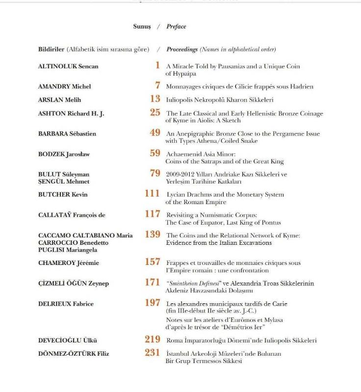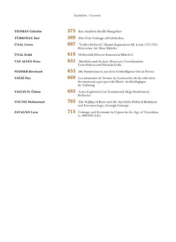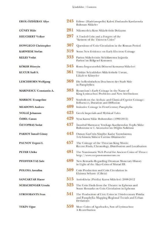 İÇİNDEKİLER *Sencan Altınoluk, A Miracle Told by Pausanias and a Unique Coinof Hypaipa *Michel Amandry, Monnayages civiques de Cilicie frappés sous Hadrien *Melih Arslan, Iuliopolis Nekropolü Kharon Sikkeleri *Richard H. J. Ashton, The Late Classical and Early Hellenistic Bronze Coinage of Kyme in Aiolis: A Sketch *Sébastien Barbara, An Anepigraphic Bronze Close to the Pergamene Issue with Types Athena/Coiled Snake *Jarosław Bodzek, Achaemenid Asia Minor: Coins of the Satraps and of the Great King *Süleyman Bulut – Mehmet Şengül, 2009-2012 Yılları Andriake Kazı Sikkeleri ve Yerleşim Tarihine Katkıları *Kevin Butcher, Lycian Drachms and the Monetary System of the Roman Empire *François de Callataÿ, Revisiting a Numismatic Corpus: The Case of Eupator, Last King of Pontus *Maria Caccamo Caltabiano – Benedetto Carroccio – Mariangela Puglisi, The Coins and the Relational Network of Kyme: Evidence from the Italian Excavations *Jérémie Chameroy, Frappes et trouvailles de monnaies civiques sous l’Empire romain : une confrontation *Zeynep Çizmeli Öğün, “Smintheion Definesi” ve Alexandria Troas Sikkelerinin Akdeniz Havzasındaki Dolaşımı *Fabrice Delrieux, Les alexandres municipaux tardifs de Carie (fin IIIe-début IIe siècle av. J.-C.) Notes sur les ateliers d’Eurômos et Mylasa d’après le trésor de “Démétrios Ier” *Ülkü Devecioğlu, Roma İmparatorluğu Dönemi’nde Iuliopolis Sikkeleri *Filiz Dönmez-Öztürk, İstanbul Arkeoloji Müzeleri’nde Bulunan Bir Grup Termessos Sikkesi *Aliye Erol-Özdizbay, Edirne (Hadrianopolis) Kalesi Zindanaltı Kazılarında Bulunan Sikkeler *Hâle Güney, Nikomedeia Kent Sikkelerinin Dolaşımı *Volker Heuchert, A Tooled Coin and a Forgery of the “Koinon of the Thirteen Cities” *Christopher Howgego, Questions of Coin Circulation in the Roman Period *Stefan Karwiese, Some New Evidence on Early Electron Coinage *Vedat Keleş, Parion Sikkelerinin Sirkülasyonu Işığında Parion’un Bölgesel Konumu *Hüseyin Köker, Roma İmparatorluk Dönemi Komama Sikkeleri *Sadi S. Kucur, Türkiye Selçukluları Sikkelerinde Unvan, Lâkab ve Künyeler *Wolfgang Leschhorn, Die hellenistischen Drachmen der Stadt Side in Pamphylien *Constantin A. Marinescu, Byzantium’s Early Coinage in the Name of King Lysimachus: Problems and New Attributions *Evangeline Markou, Symbols on the Archaic and Classical Cypriot Coinage: Influences, Duration and Diffusion *Andrew Meadows, Imitative Coinage in First-Century Pamphylia *Johannes Nollé, Greek Imperials and Mythical Tales *Canan Özbil, Nysa Kazısı Sikke Buluntuları (1992-2012) *Sedat Öztopbaş, İstanbul Marmaray Yenikapı Kazılarından Toplu Sikke Buluntusu ve I. Anastasius’un Düğün Solidusu *İsmail Günay Paksoy, Osman Gazi’nin Şimdiye Kadar Yayımlanmış Tek Gümüş Sikkesi Üzerine Düşünceler *Evgeni I. Paunov, The Coinage of the Thracian King Mostis: Recent Finds, Chronology, Distribution and Localisation *Ulrike Peter, The Numismatic Web Portal for Ancient Coins of Thrace: http://www.corpus-nummorum.eu *Şule Pfeiffer-Taş, New Remarks Regarding Ottoman Monetary History in Light of the Akçe-Coins of Murad III. *Annalisa Polosa, Coin Production and Coin Circulation in Elaiussa Sebaste (Cilicia) *Hacer Sancaktar, Antiokheia (Pisidia) Kazısı Sikkeleri: 2008-2012 *Ursula Schachinger, The Coin Finds from the Theatre in Ephesus and Some Remarks on Coin Circulation in Ephesus *Fran Stroobants, The Production of Civic Coins in Third-century Pisidia and Pamphylia: Mapping Regional Trends and Urban Deviations *Oğuz Tekin, More Coins of Agathocles, Son of Lysimachus: A Reattribution *Gültekin Teoman, Batı Anadolu Beylik Mangırları *İnci Türkoğlu, The Civic Coinage of Calchedon *Ceren Ünal, “Tralles Definesi”: Bizans İmparatoru III. Leon (717-741) Dönemine Ait Altın Sikkeler *Erdal Ünal, Hellenistik Dönem Eumeneia Sikkeleri *Peter Van Alfen, Metoikêsis and Archaic Monetary Coordination: Teos-Abdera and Phokaia-Velia *Bernhard Weisser, Die Fundmünzen aus dem Felsheiligtum Ost in Priene *Oya Yağız, Les monnaies de bronze de Lysimachie de la collection des monnaies grecques du Musée Archéologique de Tekirdağ *D. Özlem Yalçın, Limes Euphraticus’un Numismatik Değerlendirmesi: Defineler *Mohammad Younis, The Seljūqs of Rum and the Ayyubids; Political Relations and Intermarriage, through Coinage *Luca Zavagno, Coinage and Economy in Cyprus in the Age of Transition (c. 600-850 A.D.)