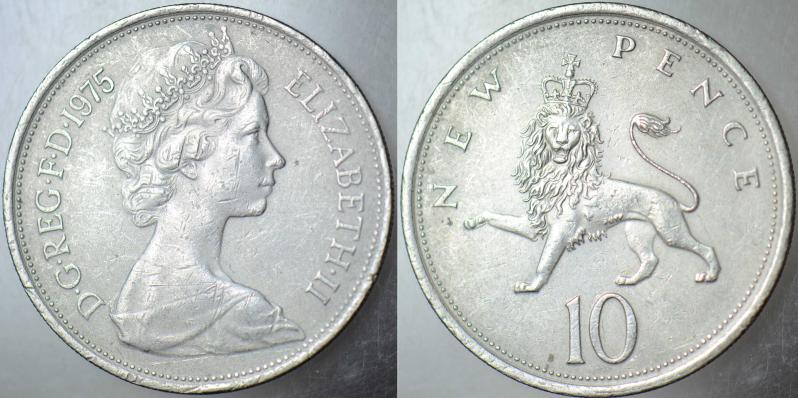 BİRLEŞİK KRALLIK 10 PENCE 1975. KRALİÇE II. ELİZABETH GENÇ BÜST. 28,5 mm BAKIR-NİKEL. İNGİLTERE, 3 ay önce satışa sunulmuştur.