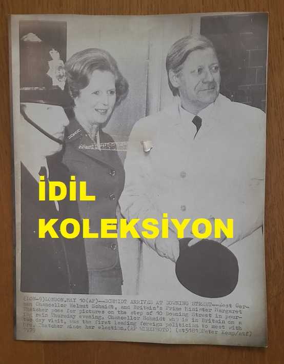 BİRLEŞİK KRALLIK ESKİ BAŞBAKANI MARGARET THATCHER'IN HABER AJANSI BASIM FOTOĞRAFI - NEWS AGENCY PHOTO OF FORMER UNITED KINGDOM PRIME MINISTER MARGARET THATCHER - 25 x 20 cm EBADINDA - İNGİLTERE BAŞBAKANI MARGARET THATCHER, PERŞEMBE AKŞAMI 10 DOWNİNG STREET'TE BATI ALMANYA ŞANSÖLYESİ HELMUT SCHMİDT İLE GÖRÜŞÜYOR. 1979 - İNGİLTERE SİYASİ TARİHİ -WEST GERMAN CHANCELLOR HELMUT SCHMIDT AND BRITAIN'S PRIME MINISTER MRS MARGARET THATCHER CHAT TOGETHER AT THE ENTRANCE TO 10 DOWNING STREET THURSDAY EVENING. 1979, 16 saat önce satışa sunulmuştur.
