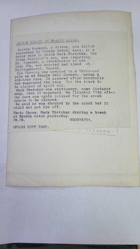 BİRLEŞİK KRALLIK ESKİ BAŞBAKANI MARGARET THATCHER'IN OĞLU MARK THATCHER'IN ORİJİNAL FOTOĞRAFI - ORIGINAL PHOTOGRAPH OF FORMER UNITED KINGDOM PRIME MINISTER MARGARET THATCHER'S SON MARK THATCHER - 20 x 15 cm EBADINDA - MARTİN RAYMOND ADLI BİR YARIŞ PİLOTU, DÜN KENT'TEKİ BRANDS HATCH'TE, BAŞBAKANIN OĞLU MARK THATCHER'IN DA YARIŞTIĞI BİR MOTOR YARIŞINDA HAYATINI KAYBETTİ. 30'LU YAŞLARININ SONLARINDA OLAN VE BORSACI OLAN BAY RAYMOND, EVLİYDİ VE SUSSEX'TEKİ BİLLİNGSHURST'TE YAŞIYORDU. MARK THATCHER DÜN BRANDS HATCH'TE BİR MOLA SIRASINDA. - İNGİLTERE SİYASET TARİHİ - (MARTIN RAYMOND, A DRIVER, WAS KILLED YESTERDAY AT BRANDS HATCH, KENT, IN A MOTOR RACE IN WHICH MARK THATCHER, THE PRIME MINISTER'S SON, WAS COMPETING. MR. RAYMOND A STOCKBROKER IN HIS LATE 30'S, WAS MARRIED AND LIVED AT BILLINGSHURTS, SUSSEX. MARK THATCHER DRURING A BREAK AT BRANDS HATCH YESTERDAY.) - ÖZEL ARŞİV, dün satışa sunulmuştur.