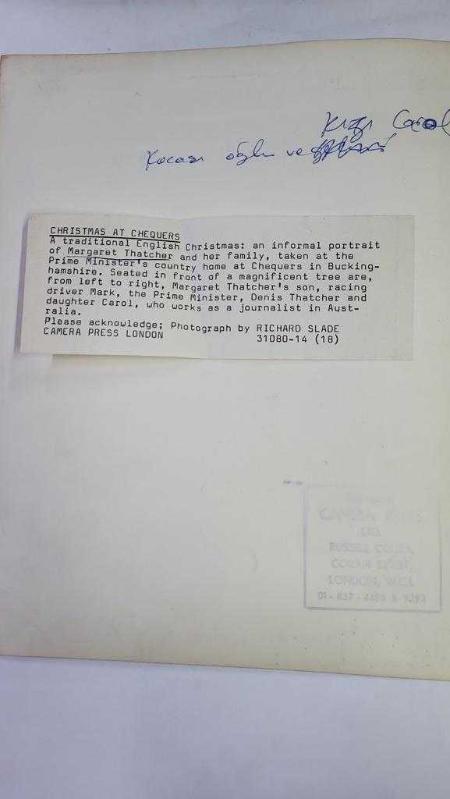 BİRLEŞİK KRALLIK ESKİ BAŞBAKANI MARGARET THATCHER'IN ORİJİNAL FOTOĞRAFI - ORIGINAL PHOTOGRAPH OF FORMER UNITED KINGDOM PRIME MINISTER MARGARET THATCHER - 25 x 20 cm EBADINDA - GELENEKSEL BİR İNGİLİZ NOEL'İ: BUCKİNGHAMSHİRE'DAKİ CHEQUERS'DA BULUNAN BAŞBAKAN MARGARET THATCHER'IN KIR EVİNDE ÇEKİLMİŞ, SAMİMİ BİR PORTRE. MUHTEŞEM BİR AĞACIN ÖNÜNDE OTURANLAR, SOLDAN SAĞA, MARGARET THATCHER'IN OĞLU MARK, BAŞBAKAN DENİS THATCHER VE AVUSTRALYA'DA GAZETECİ OLARAK ÇALIŞAN KIZI CAROL. - İNGİLTERE SİYASET TARİHİ - (A TRADITIONAL ENGLISH CHRISTMAS: AN INFORMAL PORTRAIT OF MARGARET THATCHER AND HER FAMILY, TAKEN AT THE PRIME MINISTER'S COUNTRY HOME AT CHEQUERS IN BUCKINGHAMSHIRE. SEATED IN FRONT OF A MAGNIFICENT TREE ARE, FROM LEF TO RIGHT, MARGARET THATCHER'S SON MARK, THE PRIME MINISTER, DENIS THATCHER AND DAUGHTER CAROL, WHO WORKS AS A JOURNALIST IN AUSTRALIA.. RICHARD SLADE. CAMERA PRESS LONDON) - ÖZEL ARŞİV, 3 gün önce satışa sunulmuştur.