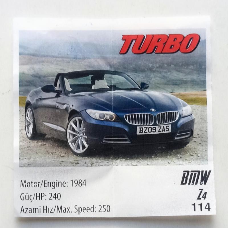 BMW Z4 Turbo Araba Turbo Sakız Kağıdı No 114 başlıklı antika/koleksiyon objesi Türkiye menşe’lidir. 2000 ve sonrası dönemine aittir.